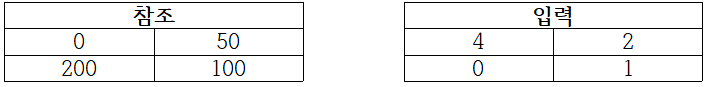 쉽게 이해하기 위해 다음과 같이 두 이미지가 [0 50 ; 200 100], [4 2 ; 0 1]의 픽셀 값을 갖고 있다고 가정해 보자. 이들을 평활화하면 입력 이미지가 참조 이미지의 분포를 따라가므로 다음과 같이 될 것이다.