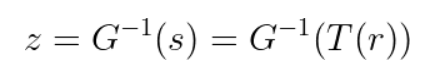 여기서 s는 입력 밝기에 대한 출력 밝기다. 히스토그램 매칭의 목적은 입력 이미지의 히스토그램 T(r)을 참조 이미지의 히스토그램을 G(z)와 동일하게 만드는 것이다. 즉, 입력 이미지의 각 픽셀 값 r에 대한 새로운 픽셀 값이 참조 이미지의 픽셀 값 z의 분포를 따르게 되는 것이다. 따라서 이를 역함수의 관계로 표현하면 다음과 같다.
