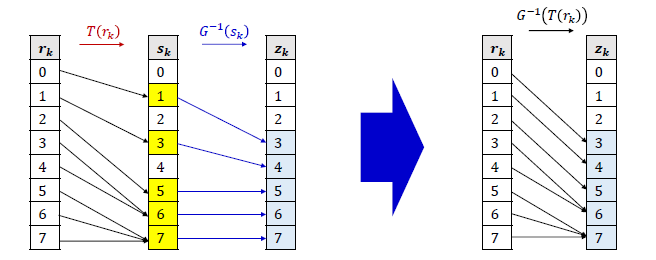 예를 들어, 타겟 이미지의 밝기 분포가 pr(r), 참조 이미지의 밝기 분포가 pz(z)라고 가정하자. 만약 두 함수가 다음과 같이 표현된다면