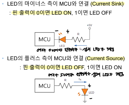 a. Current Sink: 핀의 음극이 MCU와 연결되어, 출력이 0일 때 점등되는 방식