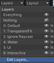 이제 카메라와 상호 작용할 개체를 선택해야 하므로, 유니티 우측 상단의 Layer를 눌러 Edit Layers를 누른다. 그리고 빈 곳에 Interactive를 입력하고 닫아주자.