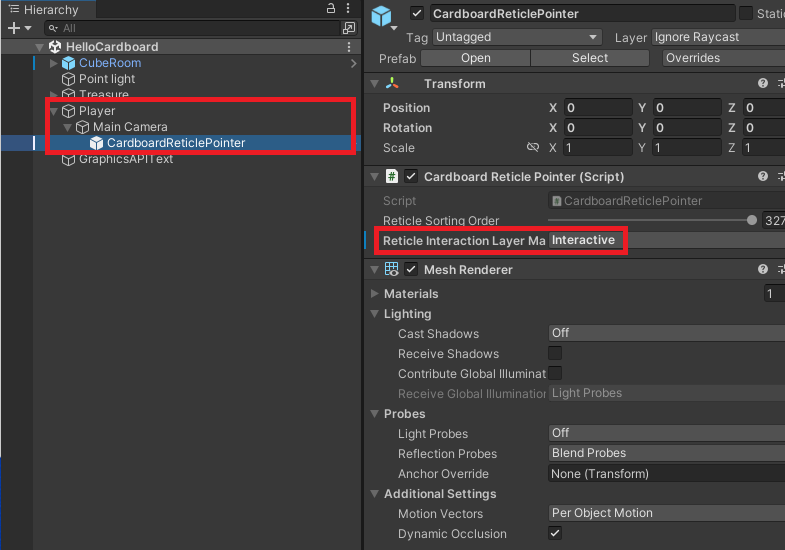 그리고 Player 오브젝트를 클릭하여 Reticle Interaction Layer Mask를 Interactive로 설정하자.