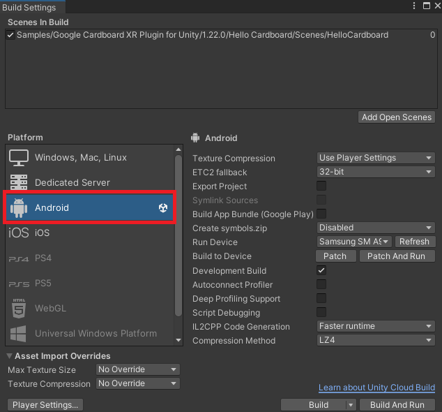 이러면 이제 기초적인 화면 세팅은 끝났다. 안드로이드로 빌드하기 위해 좌측 상단의 File을 누르고 Build Settings로 이동하자. 그리고 Android 플랫폼으로 변경하고, Add Open Scenes를 클릭해 HelloCardboard 신을 선택하자.