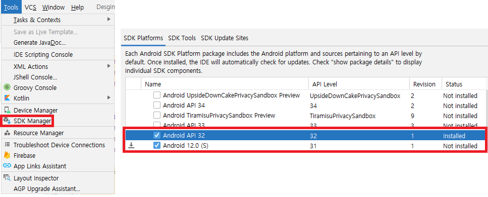안드로이드 스튜디오를 다운로드하였으면, Tools를 눌러 SDK Manager를 연다. 구글 카드보드 튜토리얼에서 요구하는 최소 치는 Android 7.0이지만, 후술 할 Target API Level이 31이므로 Android API 31를 설치해 주자. 이때 경로를 잘 기억해 두자.