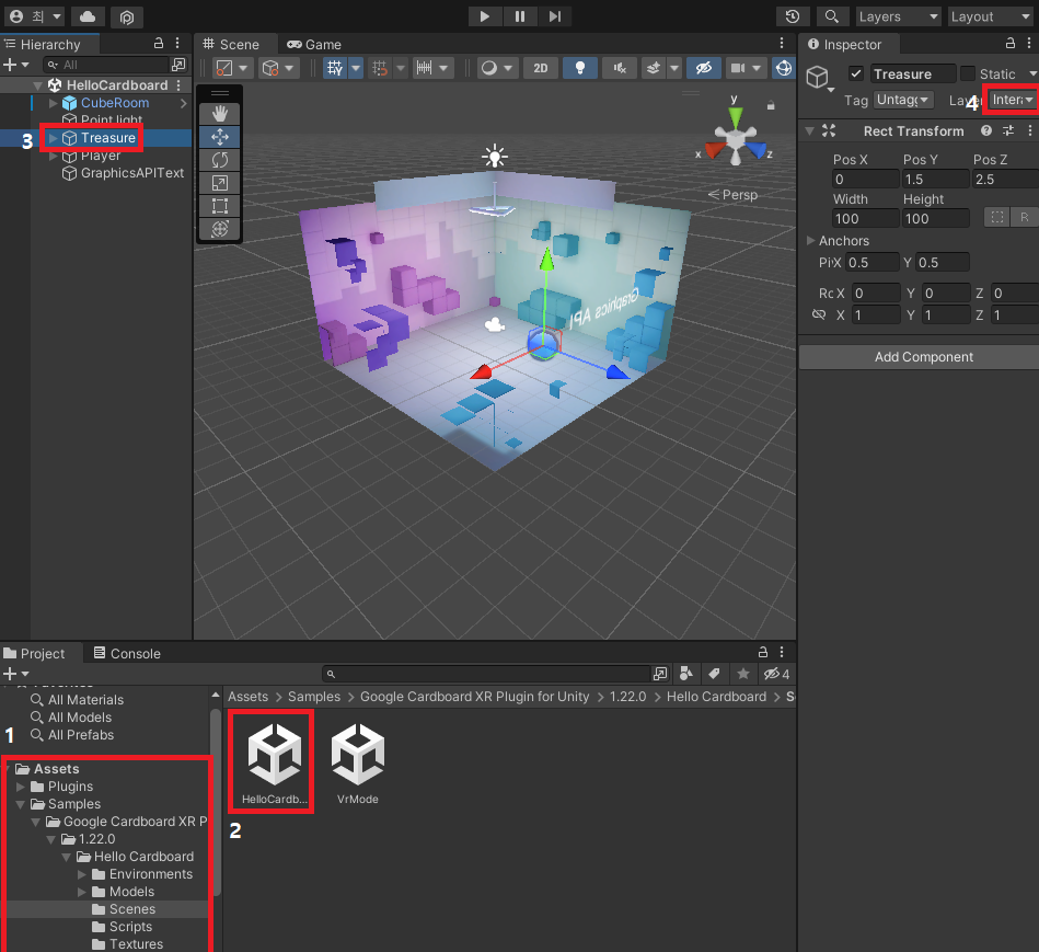 본격적으로 화면을 구성하기 위해 좌측 하단의 폴더로 이동하여 HelloCardboard Scene으로 이동하여, Treasure 오브젝트의 Layer를 interactive로 설정하자.