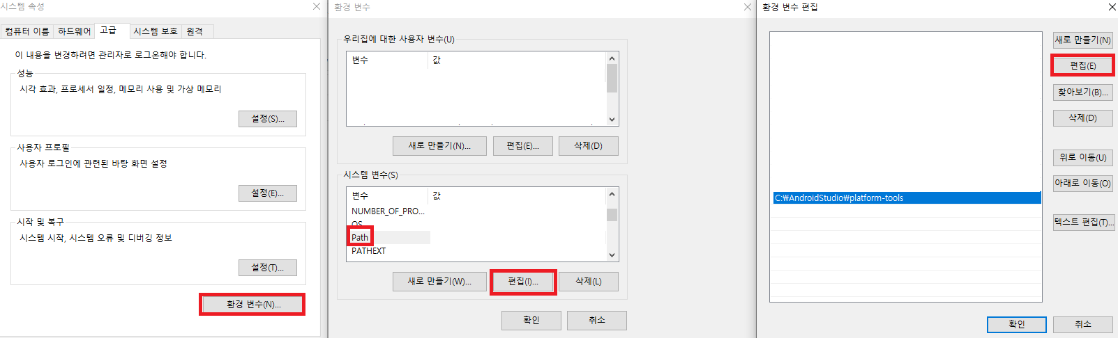 설치가 완료됐다면, 해당 경로를 환경 변수에 추가해줘야 한다. 필자의 경우 Android Studio를 C:\AndroidStudio에 설치했기 때문에, 해당 폴더에 platform-tools를 경로로 설정해 주었다(adb.exe 파일이 있는 경로)