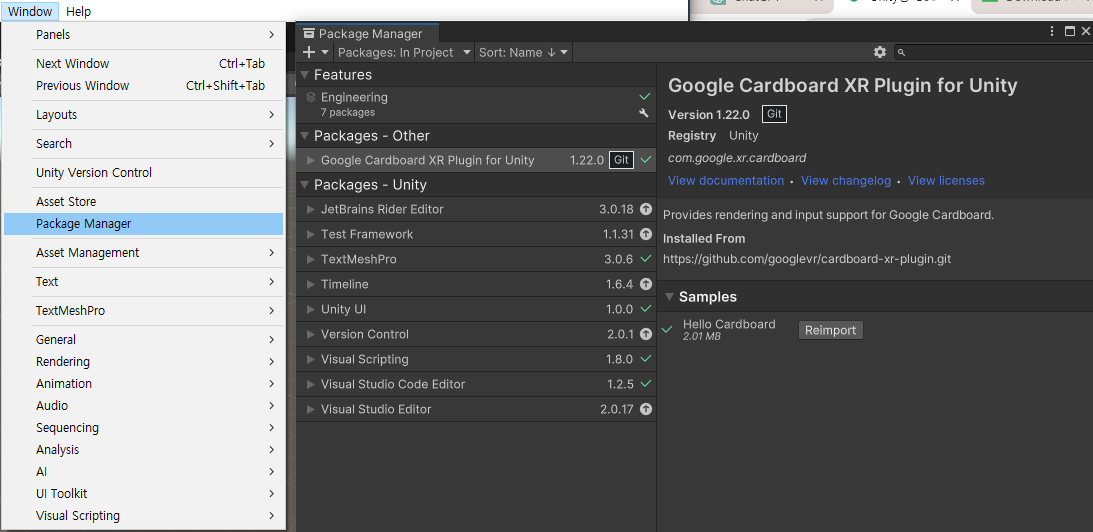 설치가 완료되었으면 상단의 화면처럼 Google Cardboard XR Plugin for Unity가 설치될 것이다. 그리고 Sample에 있는 Hello Cardboard를 가져오자. 참고로, 공식적으로는 유니티가 2019 버전부터 cardboard 지원을 종료하여 플러그인을 직접 수동으로 설치하는 과정이 필요하다.