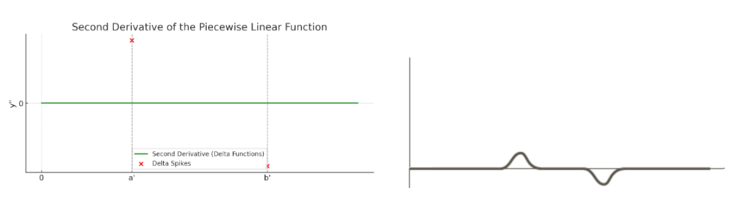 0부터 a'까지는 기울기의 변화가 없으므로 이 구간의 도함수 값은 0이 된다. a'부터 b'까지는 기울기가 일정하게 유지되므로 도함수는 상수가 될 것이다. b' 이후로는 다시 기울기에 변화가 없기 때문에, 도함수는 0으로 돌아간다. 이 함수를 한 번 더 미분하면 a'에서는 값이 증가하고, b'에서는 값이 감소하는 형태의 그래프를 예상할 수 있다.