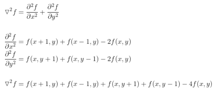 물론 대각선에 1을 채우고 중앙에 -4를 더하는 라플라스 필터도 존재하고, 기준 값을 양수로 만들기 위해 전체 행렬에 -1을 곱하는 필터도 존재한다. 따라서 원본 이미지 배열 f(x,y)에 라플라스 필터를 적용하면 다음과 같은 수식이 된다.