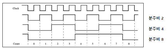 8비트 타이머/카운터는 카운트 레지스터를 갖고 있어 0부터 255까지의 값을 업/다운 계수(Count)가 가능하다. 그리고 10비트의 프리스케일러를 보유하고 있어, 다양한 클럭 소스를 선택할 수 있다. 즉, 카운트 속도를 조절하는 기능을 갖추고 있으므로, 다양한 시간 범위의 타이밍을 정할 수 있다. 이 프리 스케일러 기능이 타이머/카운터의 핵심인데, 이를 이해하기 위해 다음 자료를 보자.
