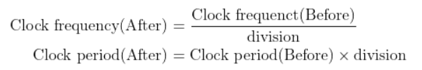 프리스케일러(Pre-scaler)는 이러한 고속의 클럭을 사용할 때 나타나는 한계를 해결하기 위해, 클럭을 나눠 더 느린 클럭을 생성하는 장치다. 즉, 이전의 클럭 주파수 혹은 주기에 분주비를 나눠 클럭의 속도를 조절하는 것이다. 위의 그래프에서 분주비를 크게 할 때마다 클럭의 주기가 늘어지는 것을 확인할 수 있다. 이를 수식으로 나타내면 다음과 같다.