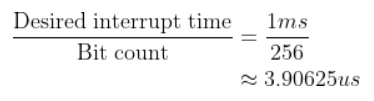 다음은 10비트 프리스케일러의 분주비에 따른 클럭 주기와 최대 주기(클럭 주기 * 8비트)다. 이를 이용하여 타이머의 주기를 계산하려면 다음과 같은 수식을 이용하면 된다.