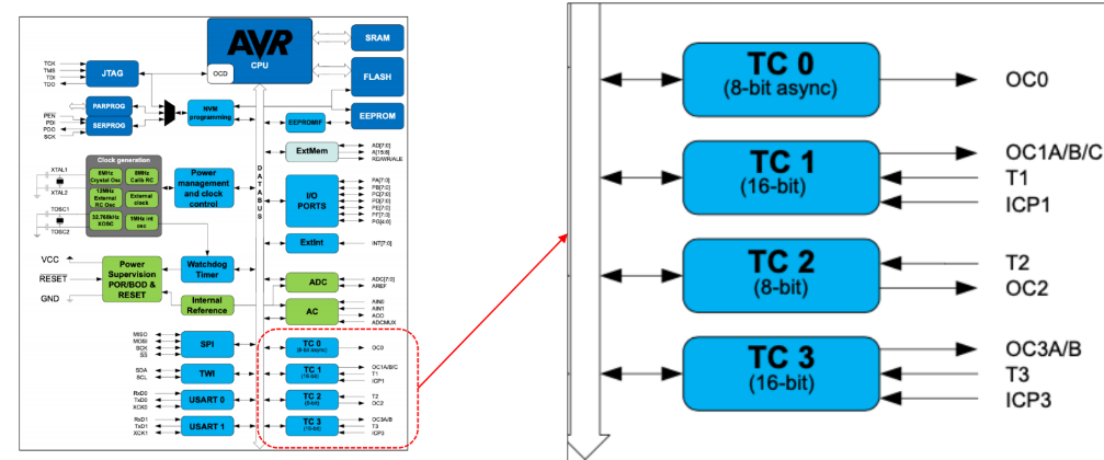타이머/카운터(Timer/Counter)는 시간 관련 작업을 처리하고, 일정 시간 간격을 측정하거나, 특정 이벤트의 발생 횟수를 세는 데 사용된다. 이때 클럭의 주파수를 알면 클럭 주기를 알 수 있으므로, 타이머로 활용할 수 있다. 예를 들어, 3bit 타이머/카운터의 경우, 카운터의 상태가 111에서 000으로 변화할 때 오버플로우 인터럽트 플래그가 발생한다. 이때, MCU 내부 클럭을 사용하는 것을 타이머 모드, 외부 클럭 또는 외부 이벤트를 사용하는 것을 카운터 모드라고 한다.
