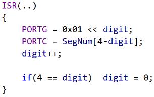다음과 같이 FND 디스플레이에 어떠한 배열(FND에 차례대로 1, 2, 3, 4가 출력되게 하는)의 숫자를 1ms마다 출력하는 코드가 있다고 가정해 보자. 이때 이전에 작성했던 코드를 보면 알 수 있듯이, FND는 동적 구동 방식을 채용하고 있으므로 1ms의 지연을 주어서 한 번에 출력하게 구현해 놓은 것이다.
