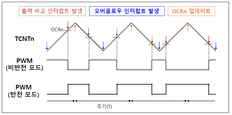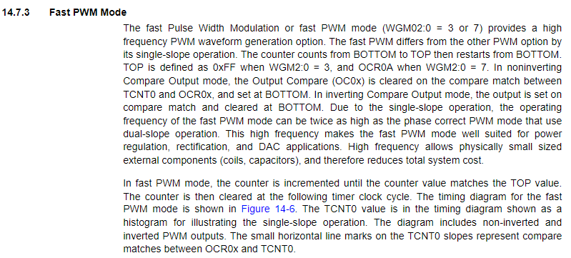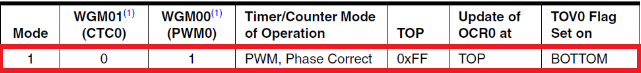 2. Update of OCR0: 타이머/카운터가 0부터 TOP까지 상승한 다음 다시 0으로 하강하기 때문에, 방향이 바뀌는 시점에서 듀티 사이클의 변경이 적용되어야 다음 하강 주기 동안 일관된 듀티 사이클을 유지할 수 있다. 또한 TOP에서 OCRn 값을 업데이트함으로써, PWM 파형의 더욱 부드러운 전환 성능을 보여주고 연속적인 듀티 사이클을 유지해야 하므로 TOP에서 업데이트된다.
