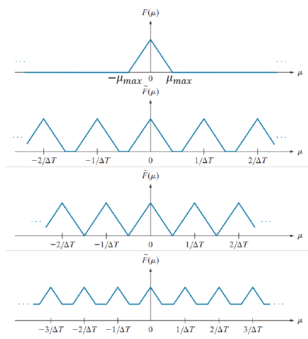 푸리에 변환을 적용한 주기적인 임펄스 열은 위의 수식이 나온다고 했었다. 샘플링 간격 △T는 연속적인 신호를 디지털 신호로 변환할 때 신호를 정확하게 복원할 수 있는지를 결정한다. 이러한 대역 제한 신호(Bandlimited Signal)에 대해, Nyquist-Shannon 샘플링 정리는 연속 신호를 디지털로 변환할 때 필요한 최소 샘플링 속도를 정의한다. 즉, 샘플링 속도는 신호의 최대 주파수의 두 배 이상이어야 한다.