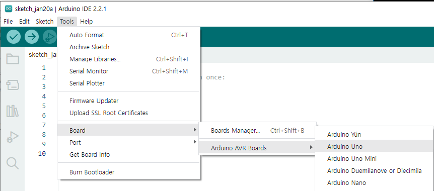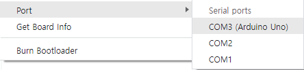 그리고 자신이 사용하고 있는 보드를 고르고, PC와 연결되어 있는 포트를 골라주면 된다.