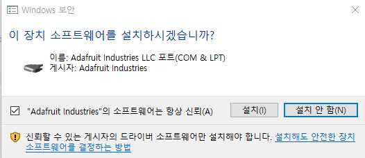 IDE 설치가 완료되었으면, 아두이노를 PC에 연결하자. 그러면 위와 같이 드라이버 설치 문구가 뜰탠데, 해당 드라이버를 설치해주면 된다.