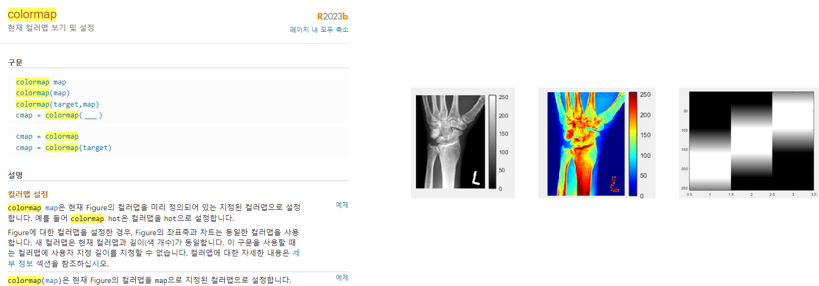 다음과 같은 사람의 손 모양의 뼈(bone.jpg)가 촬영된 이미지를 Jet 컬러맵으로 나타내 보자. 매트랩에서는 현재 figure의 컬러맵을 미리 정의되어 있는 컬러맵 map으로 설정하는 colormap 함수가 정의되어 있다. 해당 함수를 이용하여 jet 컬러맵을 명시해 주고 출력하면 우측의 사진처럼 결과가 출력된다. 이때 해당 컬러맵의 매핑 함수를 출력해 보면 다음과 같이 R, G, B가 어떤 식으로 매핑되고 있는지 확인할 수 있다.