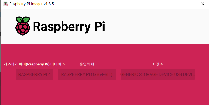 그러면 다음과 같은 Imager 프로그램이 실행될 것이다. 어떤 종류의 디바이스인지 골라주고, 라즈베리파이에 설치할 운영체제와 SD 카드 저장소를 선택하여 설치해주면 된다. 이때 SD 카드를 설치하고 있는 PC에 꽂아서 운영체제를 써줘야 한다.