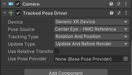 여기가 헤드셋의 움직임을 감지하기 위해 메인 카메라에 Tracked Pose Driver 컴포넌트를 추가해줘야 한다. Google Cardbard는 머리 회전을 감지하는 기능에 초점을 맞추었기 때문에, 위치 추적 기능이 없다. 따라서 앞으로 나아가는 기능을 추가하고 싶으면, 카메라의 위치는 고정하고 다른 사물을 움직여야 한다.