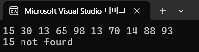 이번엔 정렬되지 않은 배열을 생성해서 임의의 수를 찾게 설계해 보았다. 분명 배열 내에 15라는 원소가 있음에도 불구하고 존재하지 않는다는 결과를 반환한다. 이는 범위를 절반으로 줄이는 과정에서 중간 값과 찾고자 하는 값을 비교하며 탐색하기 때문이다.