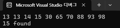 앞서 랜덤하게 생성한 배열을 정렬 후 탐색을 진행하니, 탐색 결과가 정확하게 나오는 것을 확인할 수 있다.