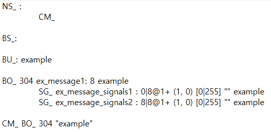 - ex) BA_ "GenMsgCycleTime" BO_ 123 500; ID 123에 대해 GenMsgCycleTime 속성 값을 500으로 설정