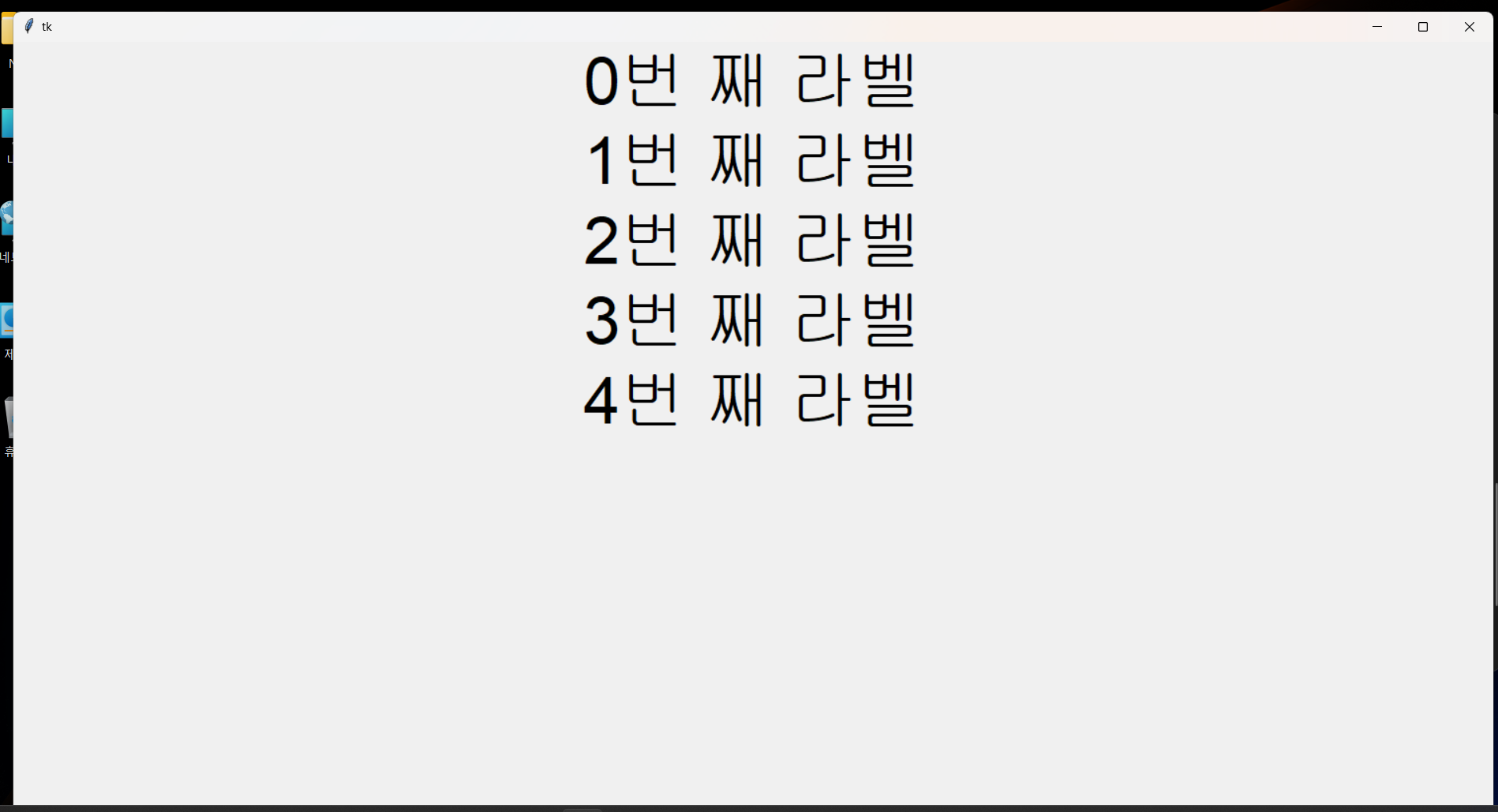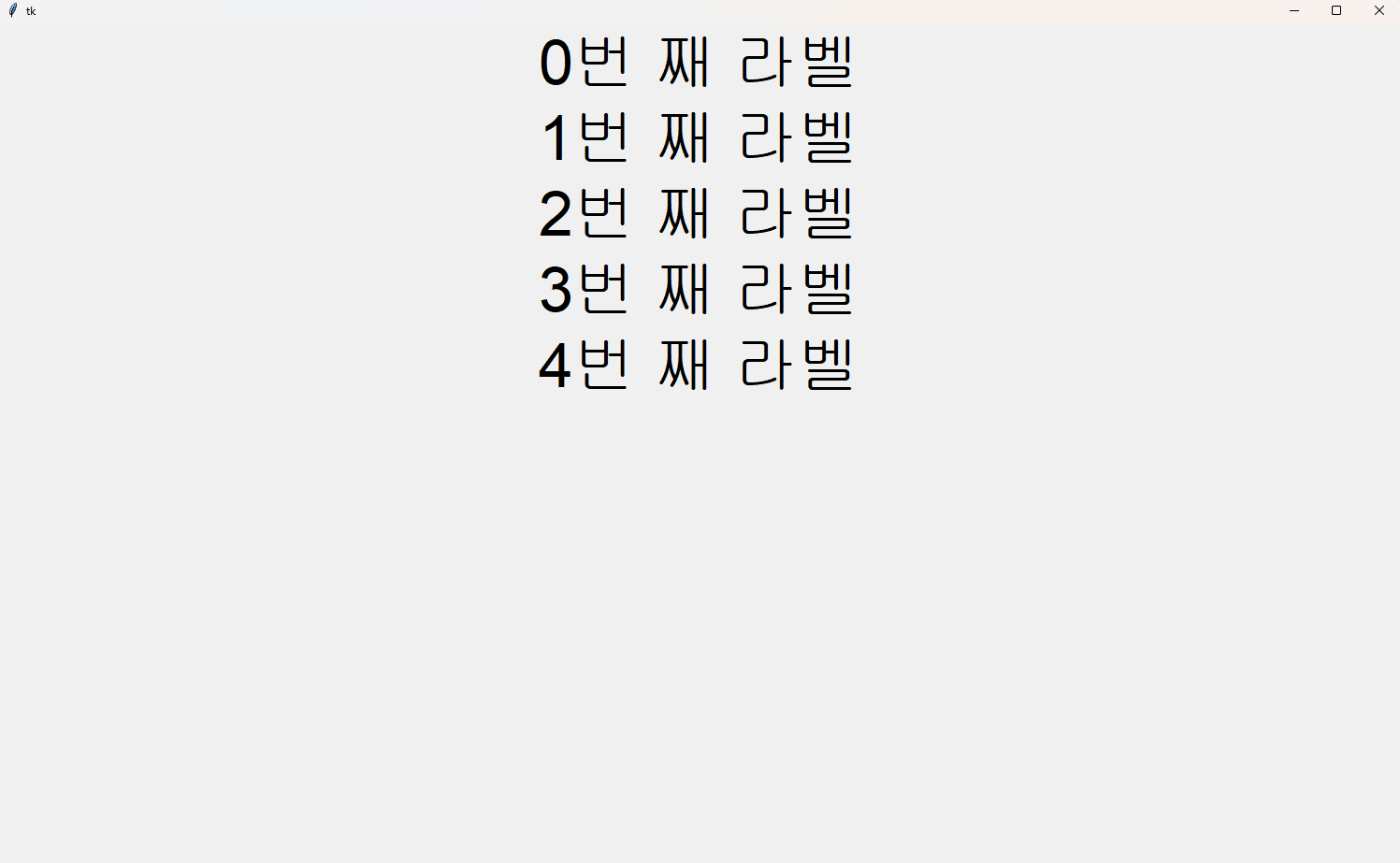 [tk.Label(root, text=f"{i}번 째 라벨", font=("Helvetica", 50)).pack() for i in range(5)]