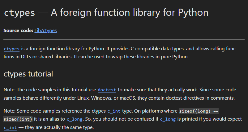 ctypes는 파이썬에서는 외부 C 라이브러리에 쉽게 접근할 수 있게 해주는 모듈이다. C와 파이썬은 서로 다른 데이터 타입을 사용하지만, ctypes는 파이썬 타입을 C 데이터 타입에 매핑하는 기능을 제공한다. 일반적으로 플랫폼 의존적인 기능에 대한 직접적인 접근과 정확성을 이유로, 운영 체제의 네이티브 API에 접근하기 위해 자주 사용한다. Windows의 경우 user32.dll에서 디스플레이에 대한 정보를 제공하기 때문에 이를 이용해 보도록 하겠다.