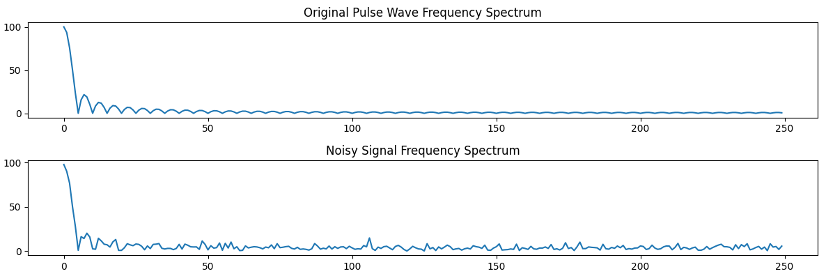 해당 노이즈 신호를 예로 들어보자. 이를 시간 축에서 노이즈를 필터링하려니 쉽지 않아 보인다. 하지만 이를 주파수 축으로 바꿔(Fourier Transform을 적용) 보면 다음과 같이 나온다. 이해하기 쉽게 노이즈가 타지 않은 깨끗한 신호와 비교해서 표시했다.