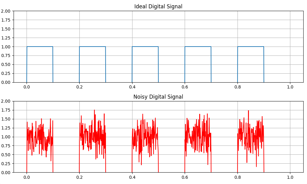 해당 그래프를 보면, 노이즈가 탄 신호가 원래 신호와 비교해서 고주파수 성분이 많은 것을 알 수 있다. 일반적으로 노이즈는 고주파수 성분이기 때문에, 해당 부분에 필터를 씌우고, 임계값을 기준으로 0과 1로 이진화하면 신호를 복원할 수 있다.