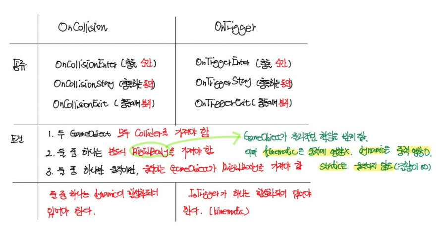 - 두 오브젝트 중 하나는 RigidBody Component를 갖고 있어야 한다.