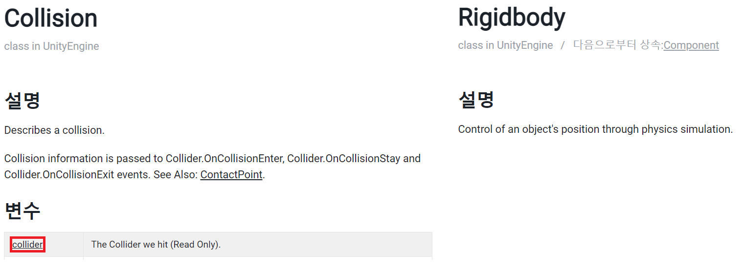 여기서 Collider란 Collison 클래스의 변수로서 충돌 영역을 설정하는 컴포넌트고, RigidBody는 물리적인 시뮬레이션을 통해 물체의 위치 등을 조절하는 컴포넌트다.