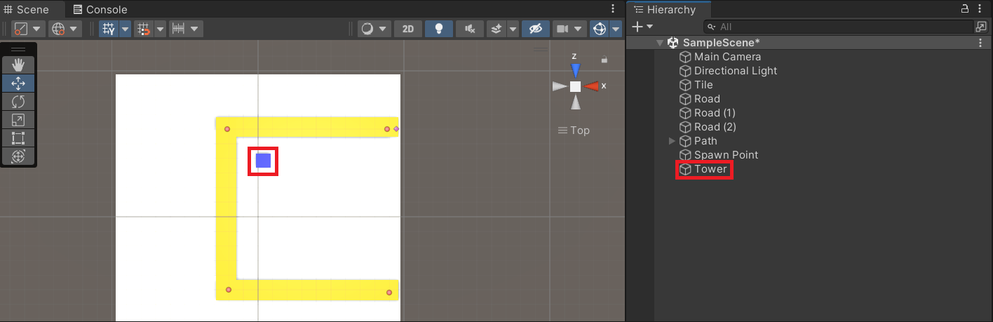 준비가 끝났으니, 충돌이 잘 이루어지고 있는지 확인하기 위해 파란색 큐브에 부착할 Tower 스크립트를 만든 후, 충돌이 일어났을 때 Console창에 "Trigger Collision"을 출력하도록 작성해보자. 이때 충돌하는 순간에 메시지를 출력할 것이므로 OnTriggerEnter() 함수를 이용하자.