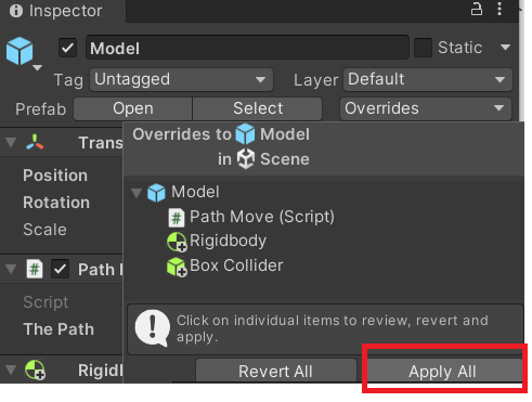 작업을 완료하였으면 프리팹이 되어 있는 Model을 오버라이드 하여 모든 변경사항을 저장해두자.
