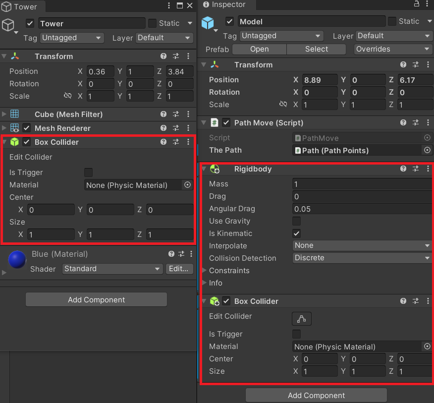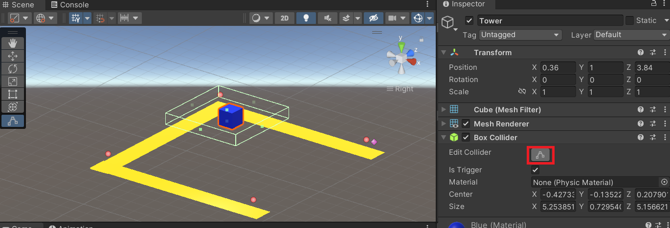 다음 사진처럼 Tower라는 이름의 큐브를 만들어, 파란색 Material을 입혀주자. 우리가 충돌을 구현 하기 위해선 몇 가지 조건이 필요하다.