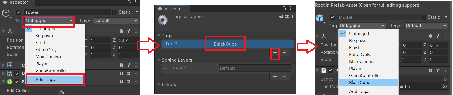 먼저 검은색 큐브의 Tag창에 Add Tag를 하여 태그를 추가해주고, 다시 검은색 큐브 창으로 돌아와 Tag를 BlackCube로 설정하자.