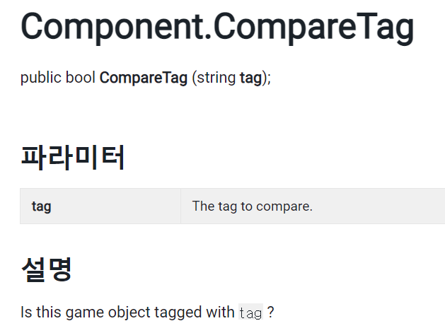 여기서 CompareTag는 부딪힌 물체 Collider other의 태그를 받아오는 함수다.
