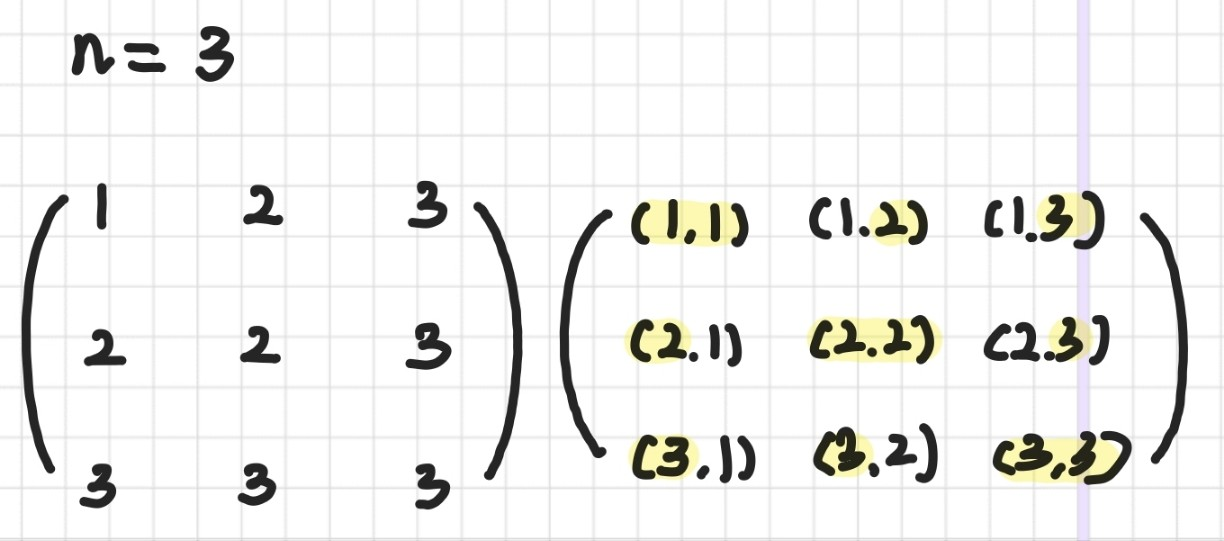즉, 1부터 n까지 수를 기준으로 하여 행이 바뀔 때마다 바뀐 수만큼의 값 증가가 있다. 이러한 규칙성을 갖고 풀어보았을 때 시간 초과 문제로 해결에 성공하지 못하였다(...)