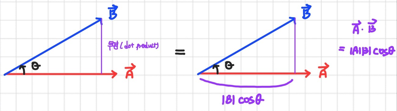 벡터의 내적(Inner product)이란 어떤 벡터를 다른 벡터로 투영한다는 의미다. 이때 투영이란 수직으로 내린 것을 의미한다. 사실 우리가 일반적으로 알고 있는 내적은 도트 곱(dot product) 혹은 스칼라 곱(scalar product)라고 부르는 내적의 한 종류다. 이런 관점에서 두 벡터의 내적을 구한다는 것을 그림으로 표현하면 다음과 같다.