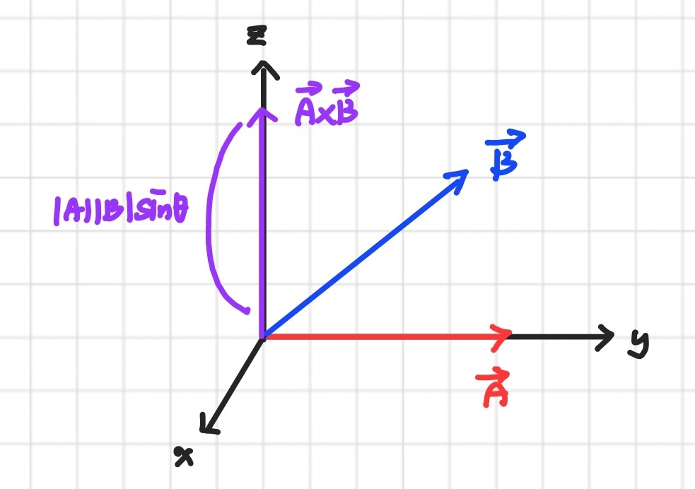 어쨌든 이러한 벡터 곱 연산을 하면 결괏값이 내적과 다르게 벡터로 나온다. 이러한 벡터는 어떤 표면에 수직인 방향을 의미하게 되는데, 조금 쉽게 다가가기 위해 두 벡터를 외적한 것을 그림으로 나타내보면