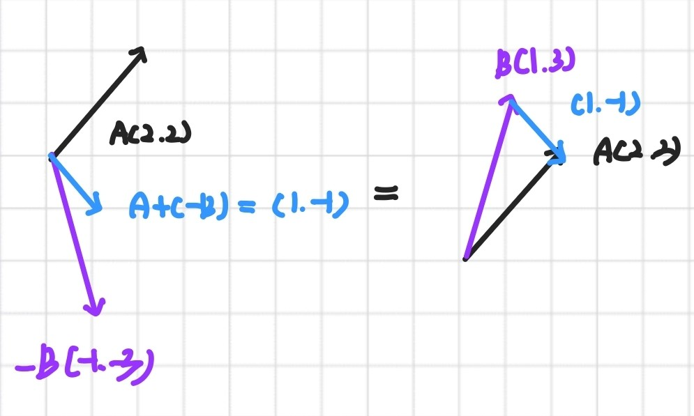 벡터 간 덧셈 뺄셈이 가능하다. 이때 두 벡터를 더하면 같은 자리의 성분끼리 합쳐진다. 예를 들어 벡터 A (2,2)와 벡터 B (1,3)을 더한다고 하면 다음과 같이 A만큼 이동한 상태에서 B만큼 더 이동한다는 기하학적 의미를 갖게 된다.
