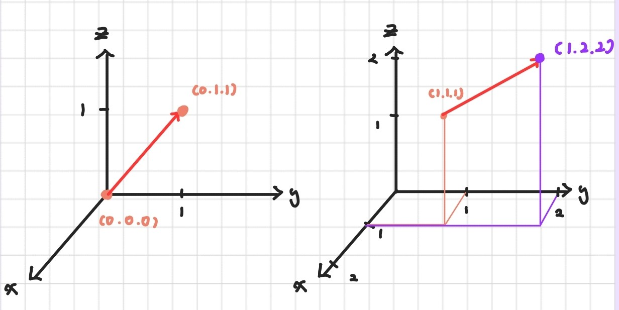 이뿐만 아니라 벡터의 값을 어떤 방향으로 얼마만큼 가고 있는지 표현할 수도 있다. 예를 들어 (0,1,1)이라는 것은 현재 좌표에서 (0,1,1)만큼 더 간다는 의미와, 나의 위치가 (0,1,1)이라는 의미로 나뉜다.
