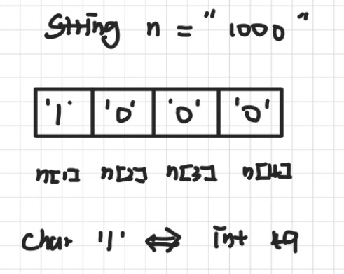 1000이라는 숫자를 문자열로 저장하면 다음과 같이 n[0] = '1', n[1] = '0', n[2] = '0', n[3] = '0' 으로 저장된다. 따라서 문자열의 크기만큼 반복을 돌릴 때 문자열에 임의 접근을 하여 48을 빼주면 자릿수별 정수가 더해지게 된다.