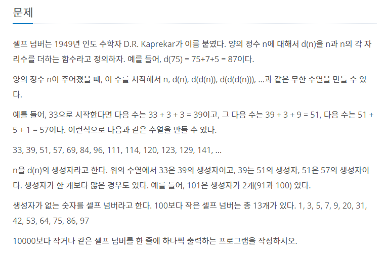 혹시 생성자가 10000보다 크게 된다면 문제의 범위를 초과하는 것이므로, 예외를 처리해준다. 그리고 다시 반복을 돌려 selfnum이 false인 것만 출력하면 문제를 해결할 수 있다.