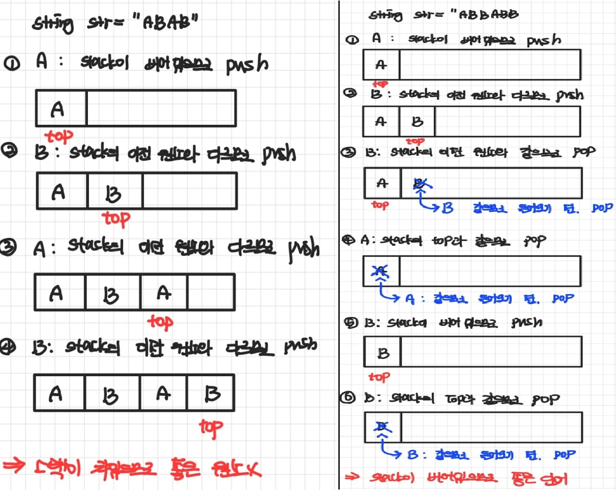 문자를 하나씩 비교하는데, 이때 앞의 문자가 이전 문자와 다르면 stack에서 pop 해주고, 그렇지 않다면 문자를 push 해주자. 이런 과정을 시각적으로 확인하면 다음과 같다.