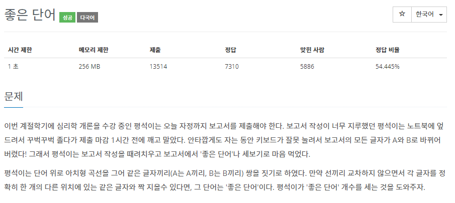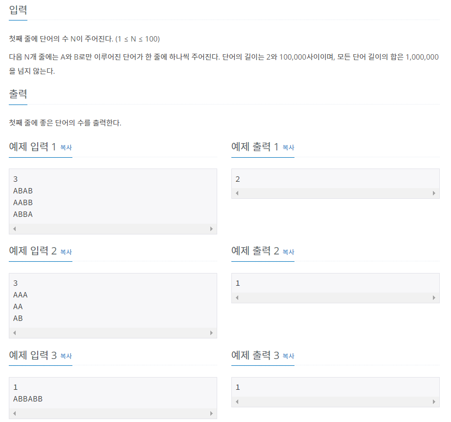 주어진 문자열에서 문자를 하나씩 확인하며 이전 문자와 비교를 하여 좋은 단어인지 확인하는 문제다. 입출력 예제를 분석해보면 다음과 같다.