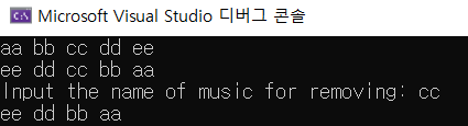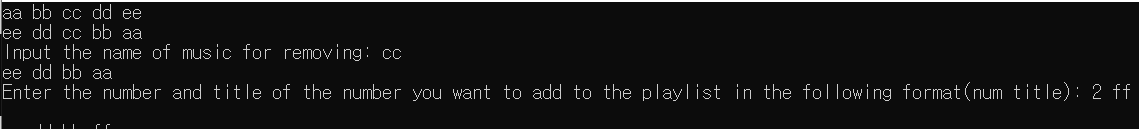 주어진 재생 목록에서 'cc'라는 제목의 노래를 remove() 함수를 이용해 제거하고 출력을 확인해보자.