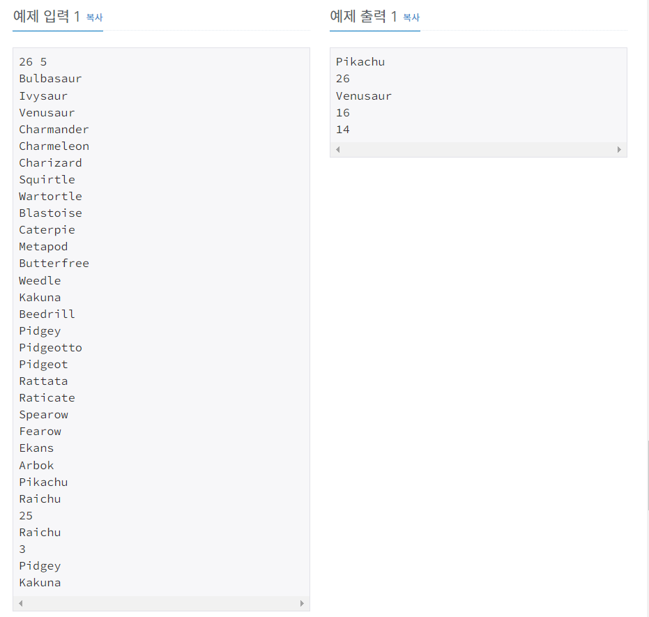 문자열을 입력받아 숫자와 매칭시키는 문제다. 정해진 개수만큼 문자열 입력이 끝나면, 숫자를 입력했을 때 문자열을 출력하고, 문자열을 입력했을 때 숫자를 출력하면 된다. 따라서 2개의 값을 매칭시키는 문제이므로 map 자료구조를 이용해 주면 된다.